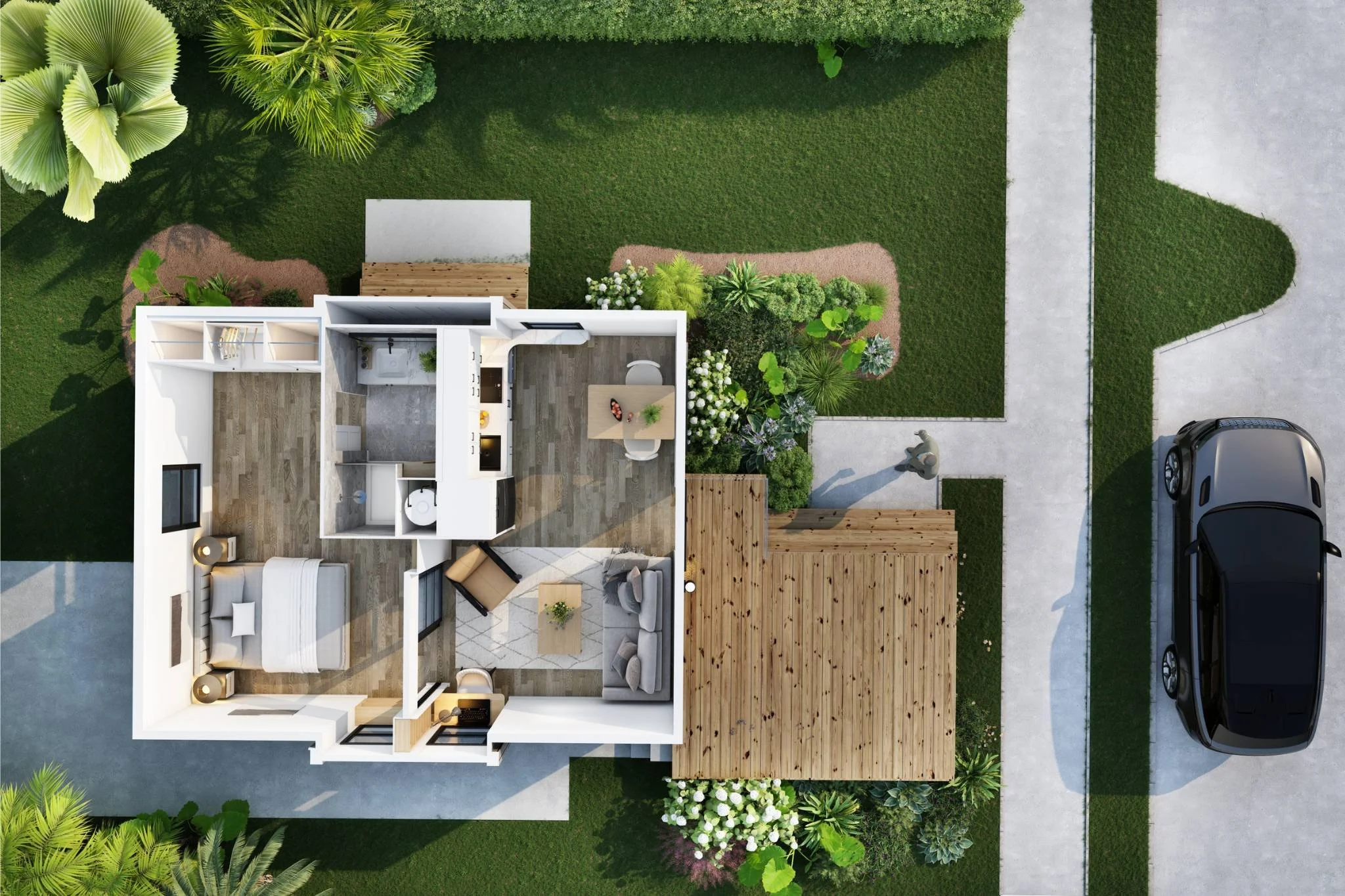 Our ADU (accessory dwelling unit) comes complete with a full kitchen and bath — perfect as a guest suite, in-law unit, private office, yoga studio, or rental property. Built on a durable concrete pier foundation and powered by a solar + lithium-ion battery system, it delivers comfort, resilience, and energy independence for years to come.